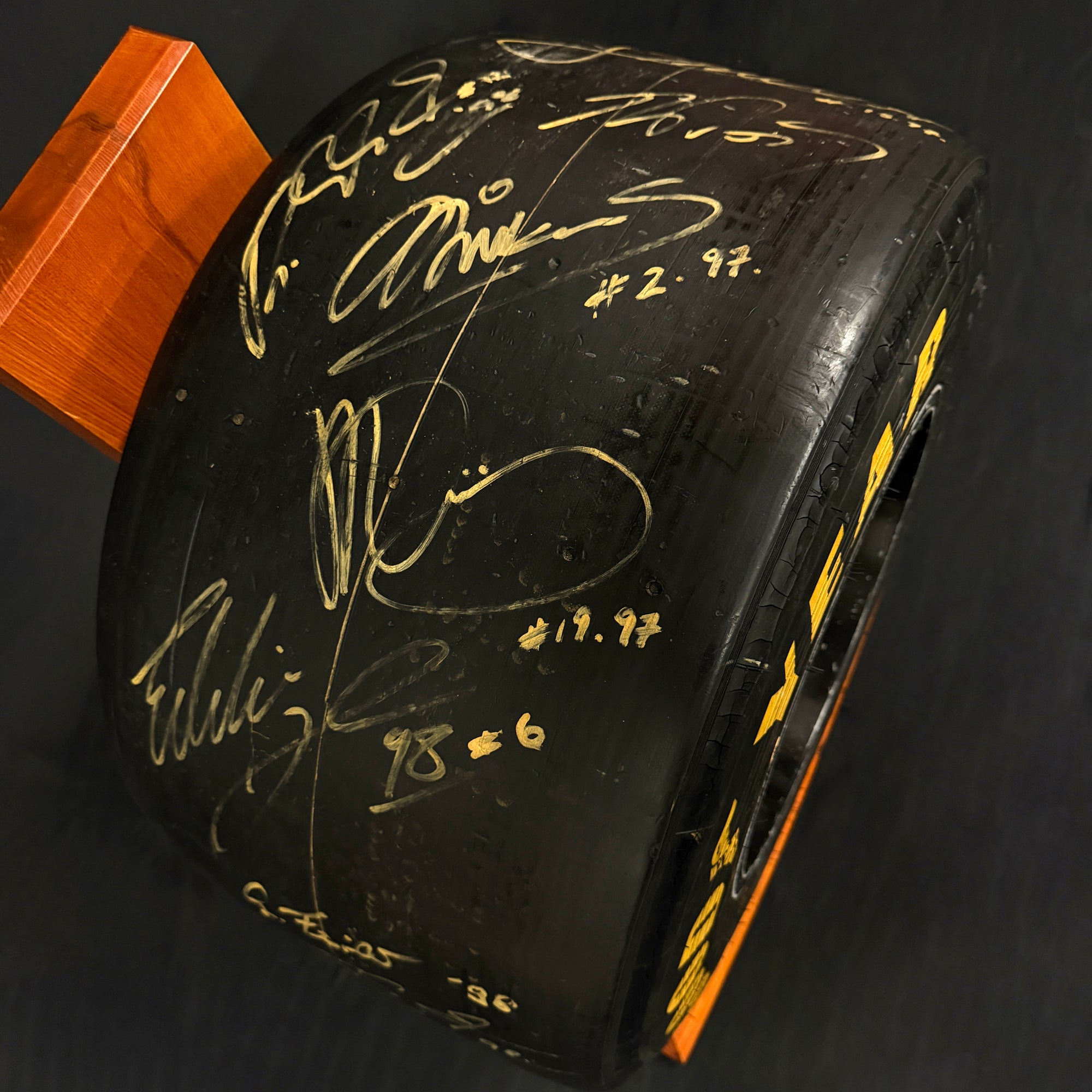 This tyre was first used on the FW19 Williams that won the World Championship in 1997; this is clear from the distinctive Yellow Oz racing rim included. Being the last Championship win to date for the team makes the applied signatures of that year’s Drivers’ Champion Jacques Villeneuve, plus his Constructors’ Champion teammate Heinz-Harald Frentzen, all the more special.