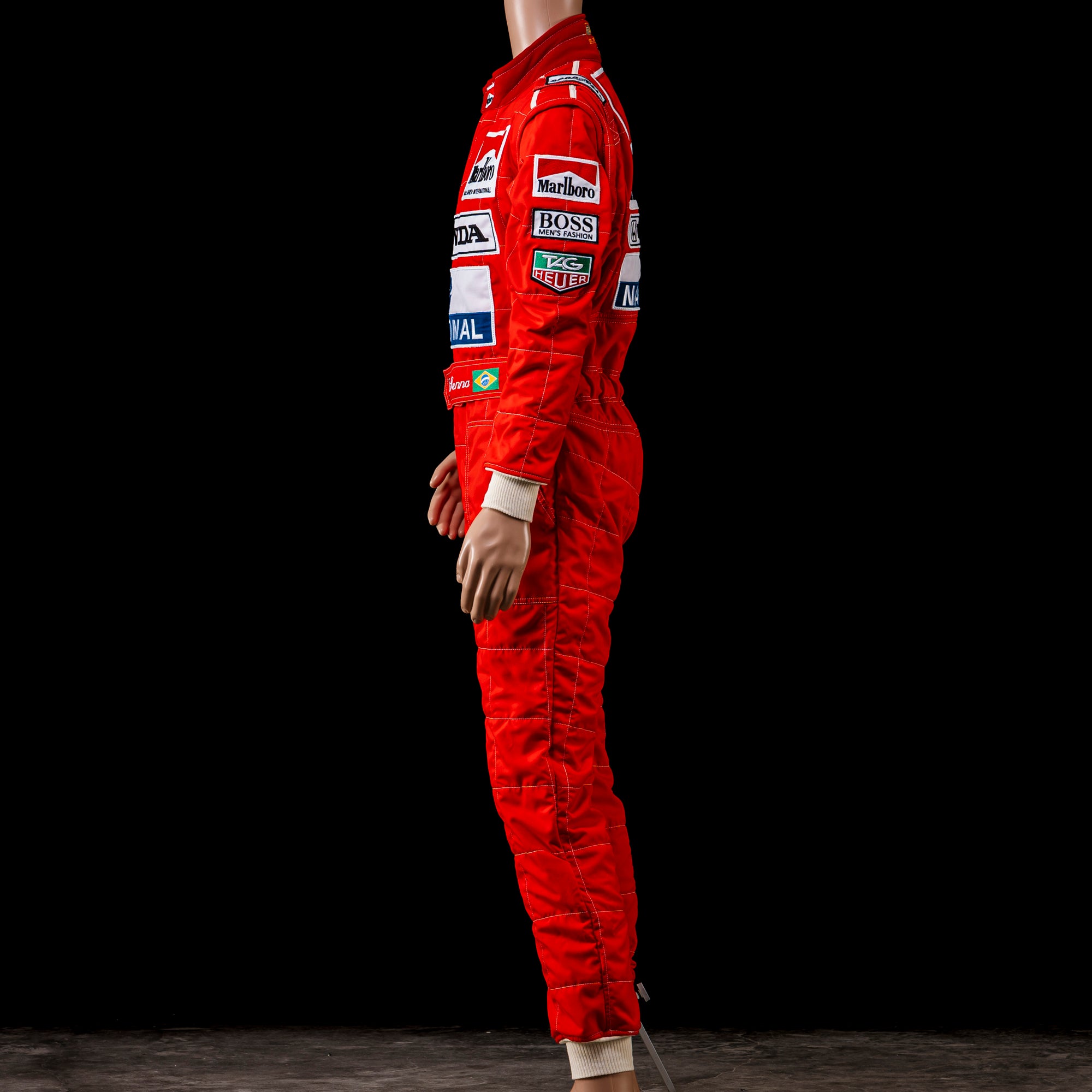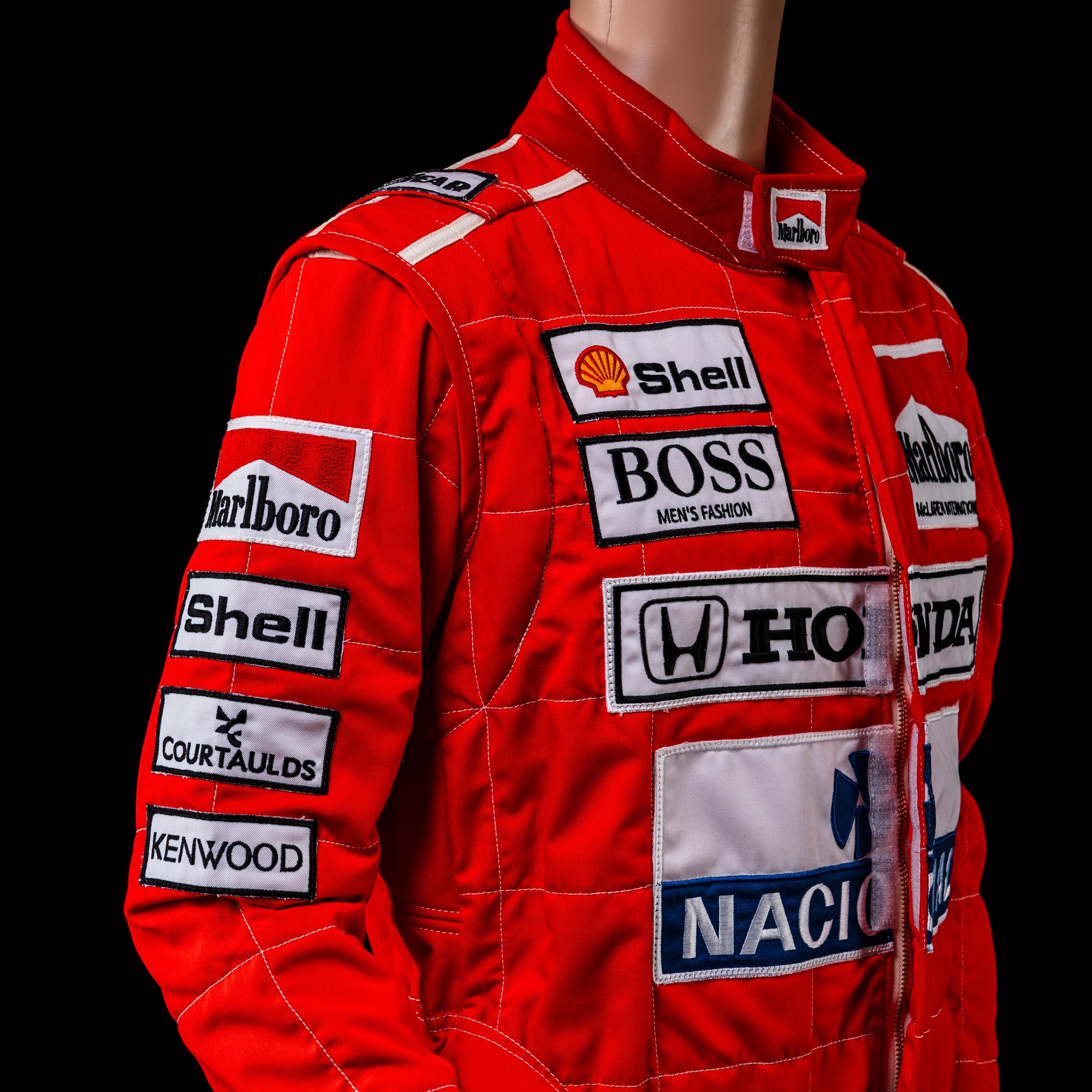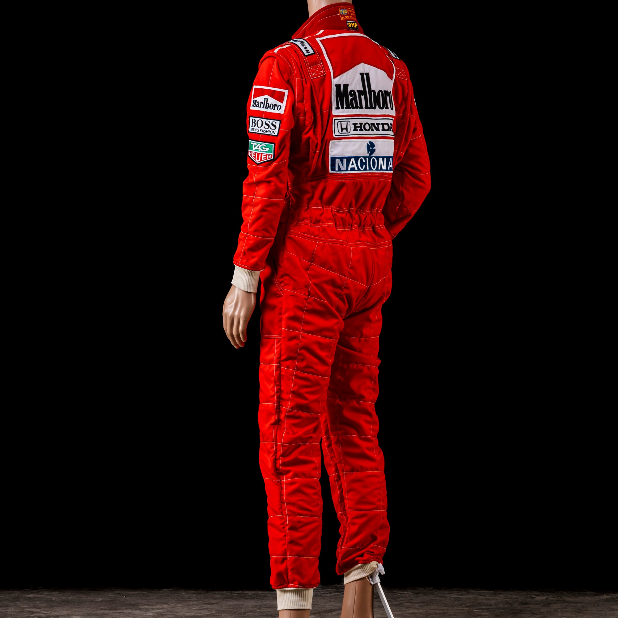 This premium replica suit faithfully recreates the design worn by Senna at the 1991 Japanese Grand Prix, featuring the classic McLaren and sponsor branding, bold red colourway, and period-correct detailing associated with his legendary MP4/6 era. From the chest patches to the arm logos, every element evokes the look of Senna at the peak of his powers.