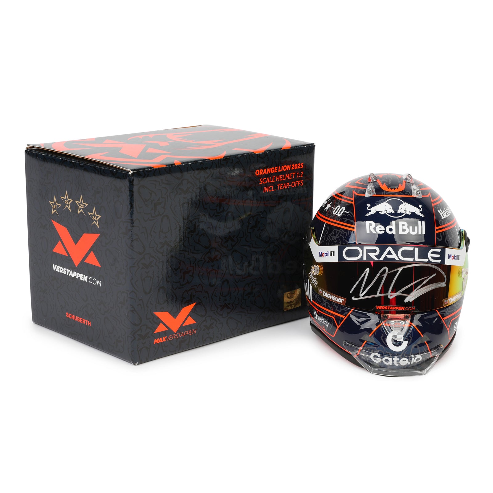 LOT 243 - Max Verstappen Signed 2025 Red Bull Racing Mini Helmet - Orange Lion