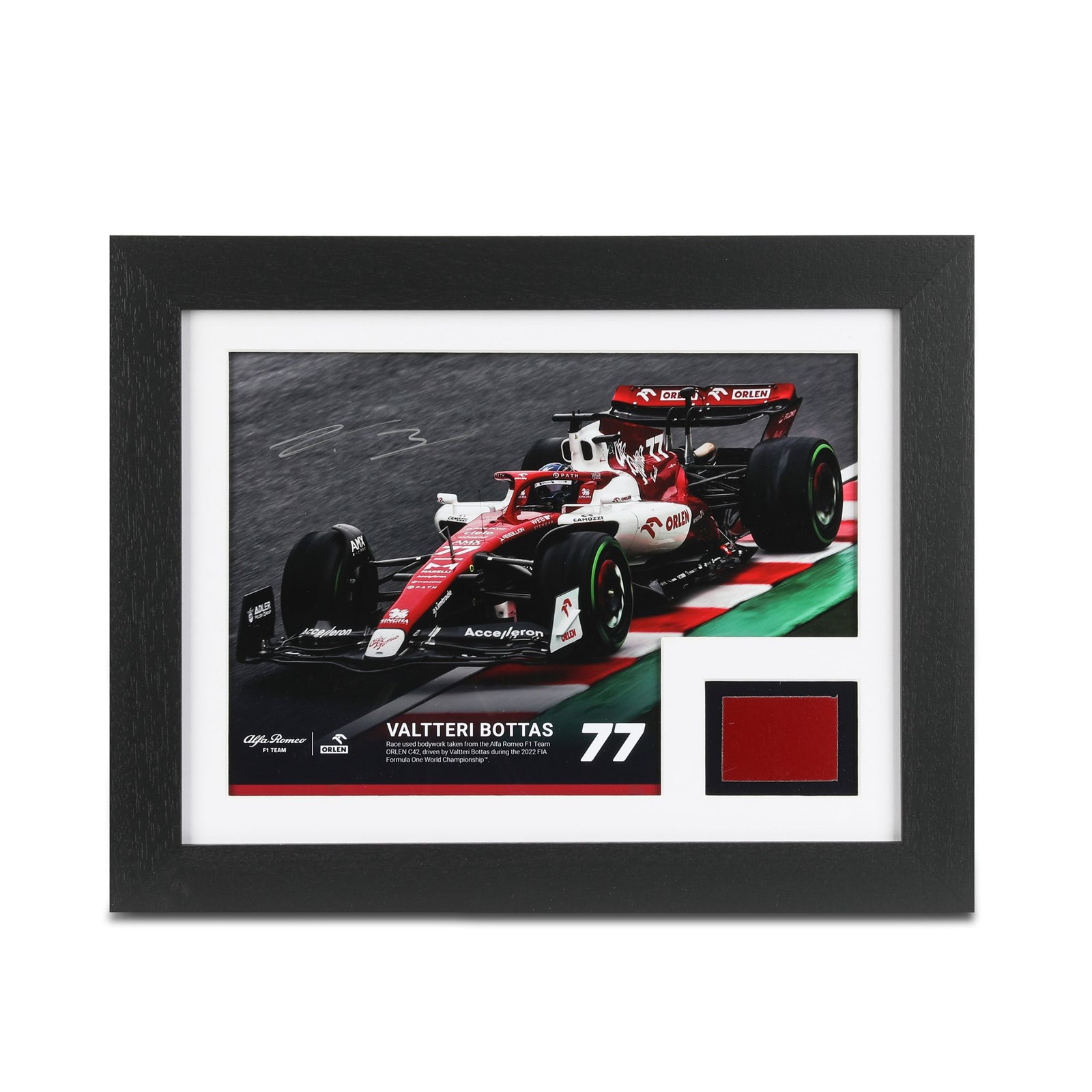 Authentic signed bodywork from Valtteri Bottas's 2022 Sauber F1 Team season, accompanied by a certified photograph. This collectible piece captures a pivotal moment in the Finnish driver's career, featuring genuine autographed components from his competitive campaign with the Swiss outfit.
