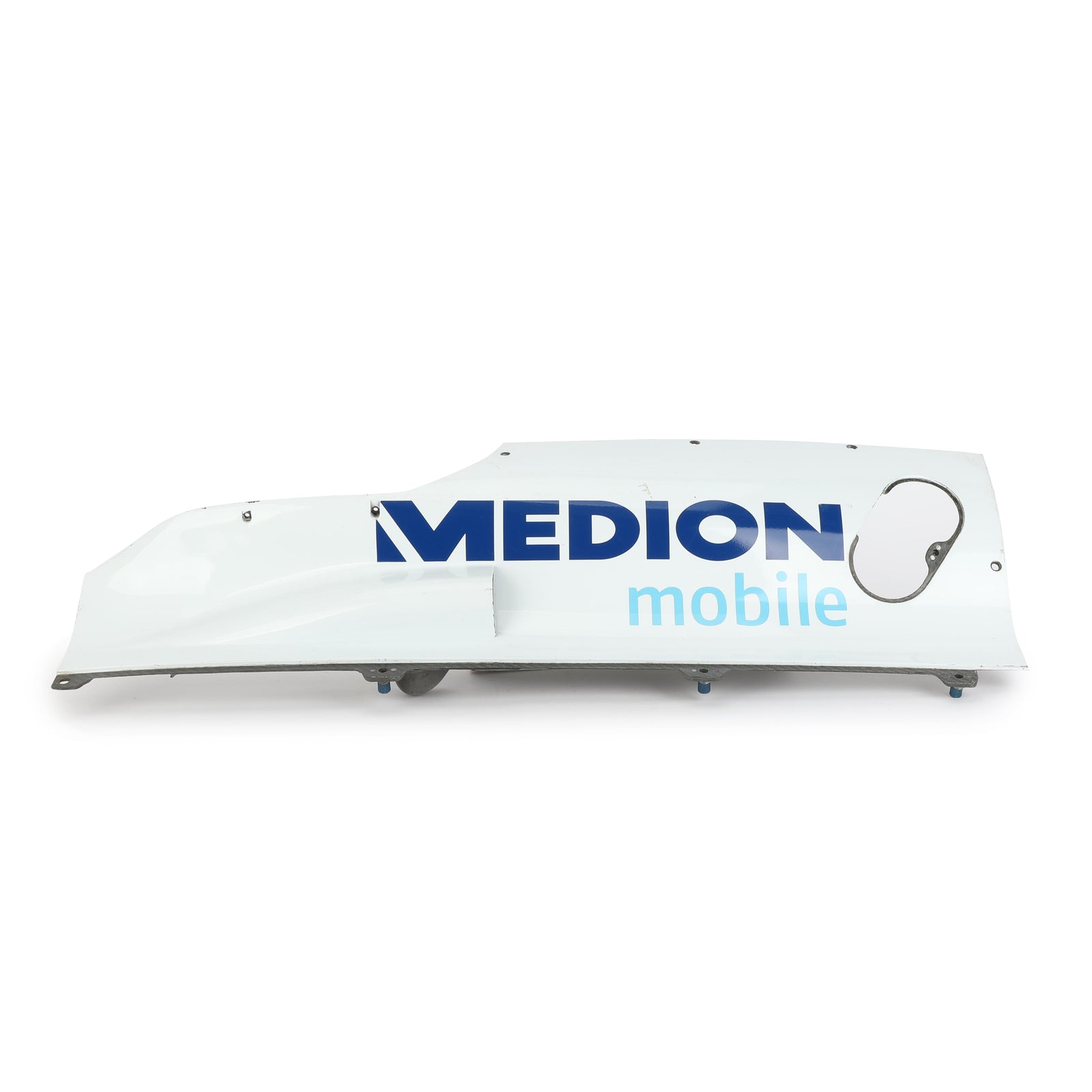 Own an original piece of bodywork from the 2010 Force India VJM03, with this race-used left-hand headrest cooling panel featuring prominent Medion sponsor branding.