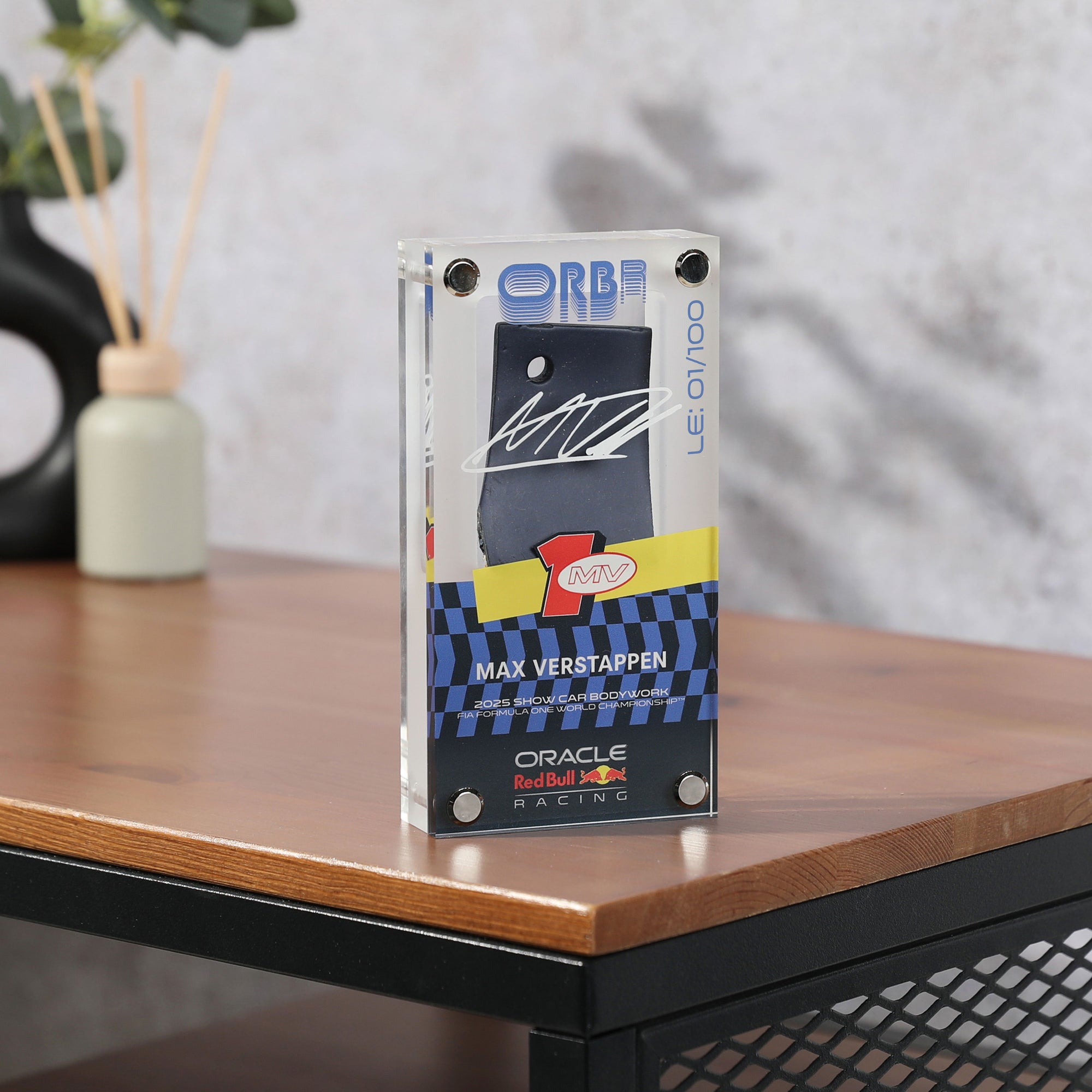 Pay tribute to four-time World Champion, Max Verstappen, with this special display, perfect for desktops and shelf collections. Featuring a replica piece of RB21 bodywork, crafted using the same processes as the bodywork on the real race cars, this sleek acrylic is a great collector’s item.