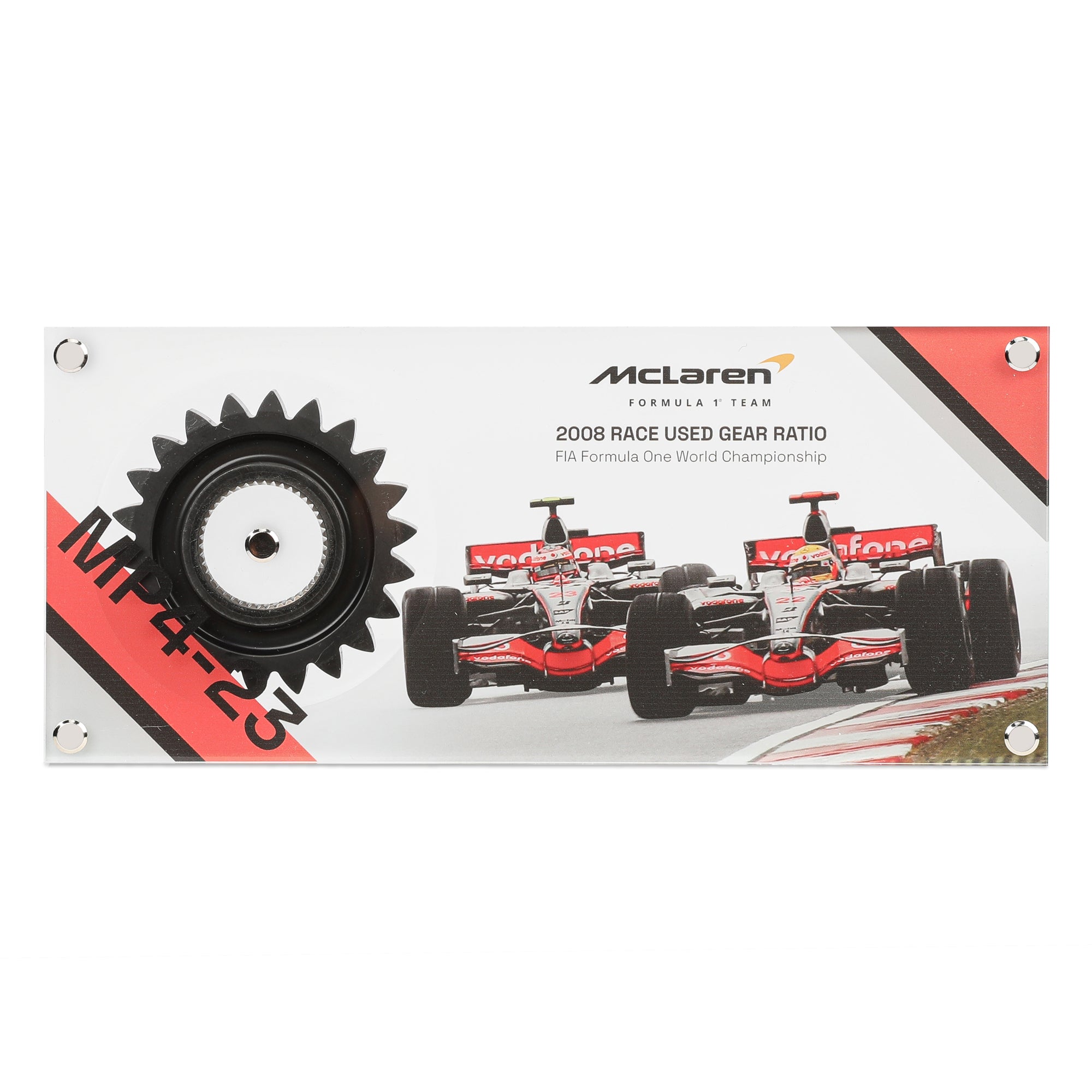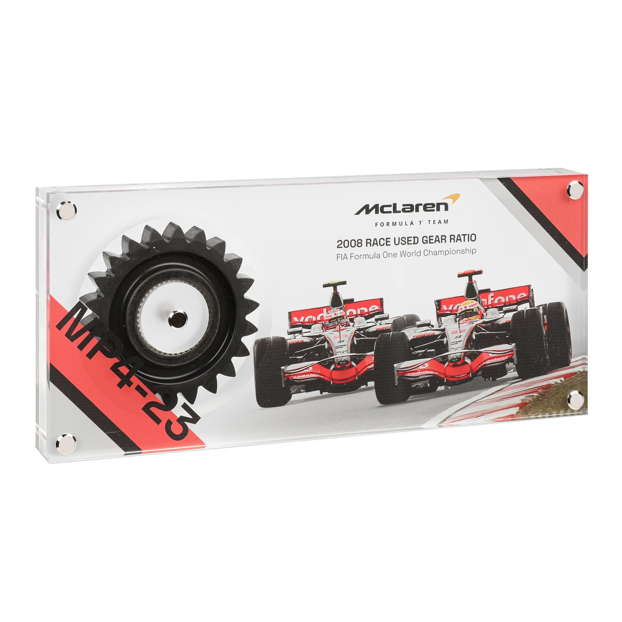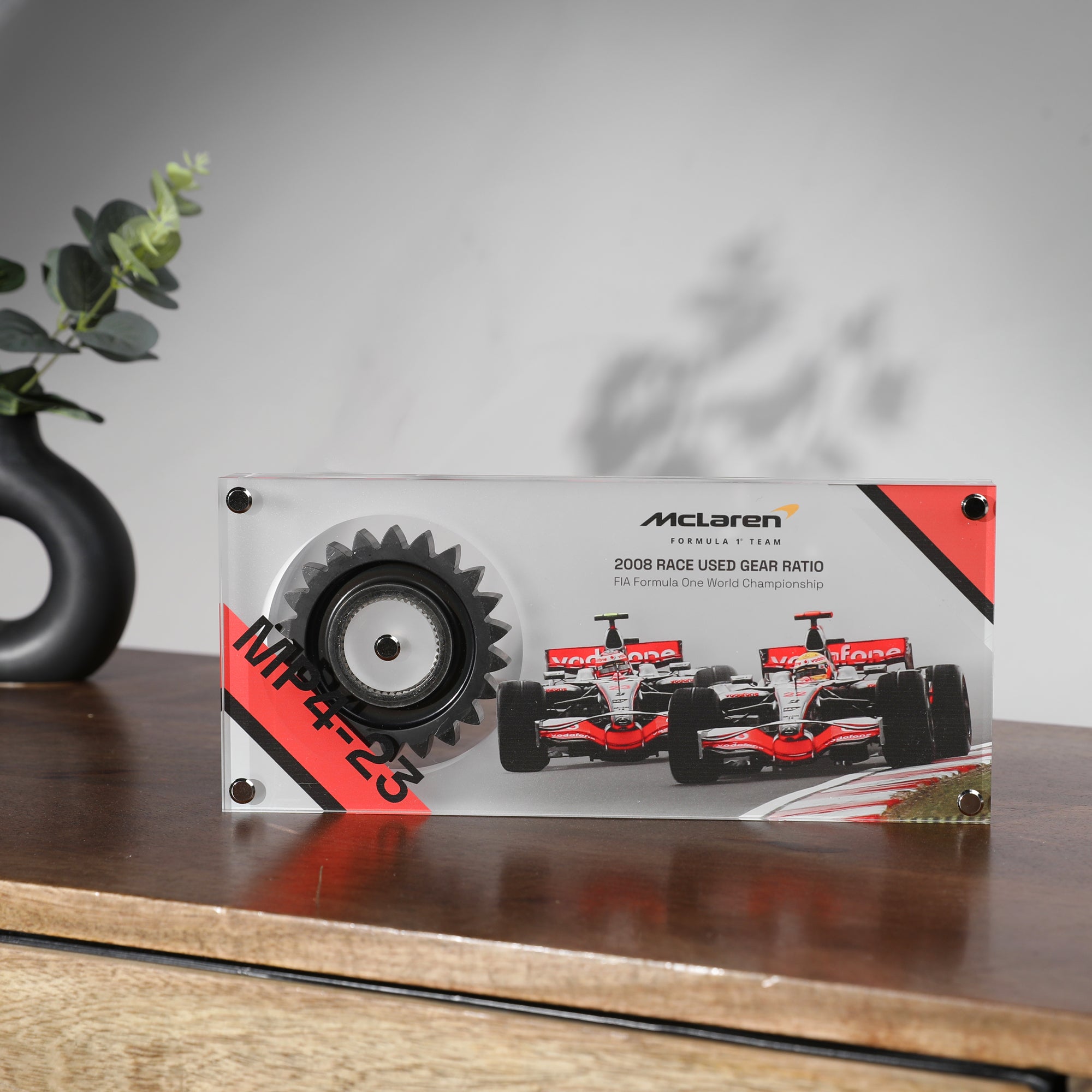 Formula 1® fans have the chance to take home a genuine piece of history with this McLaren F1® Team race used gear ratio in acrylic. This gear ratio was used on the 2008 McLaren MP4-23 and is perfectly displayed in an acrylic case.