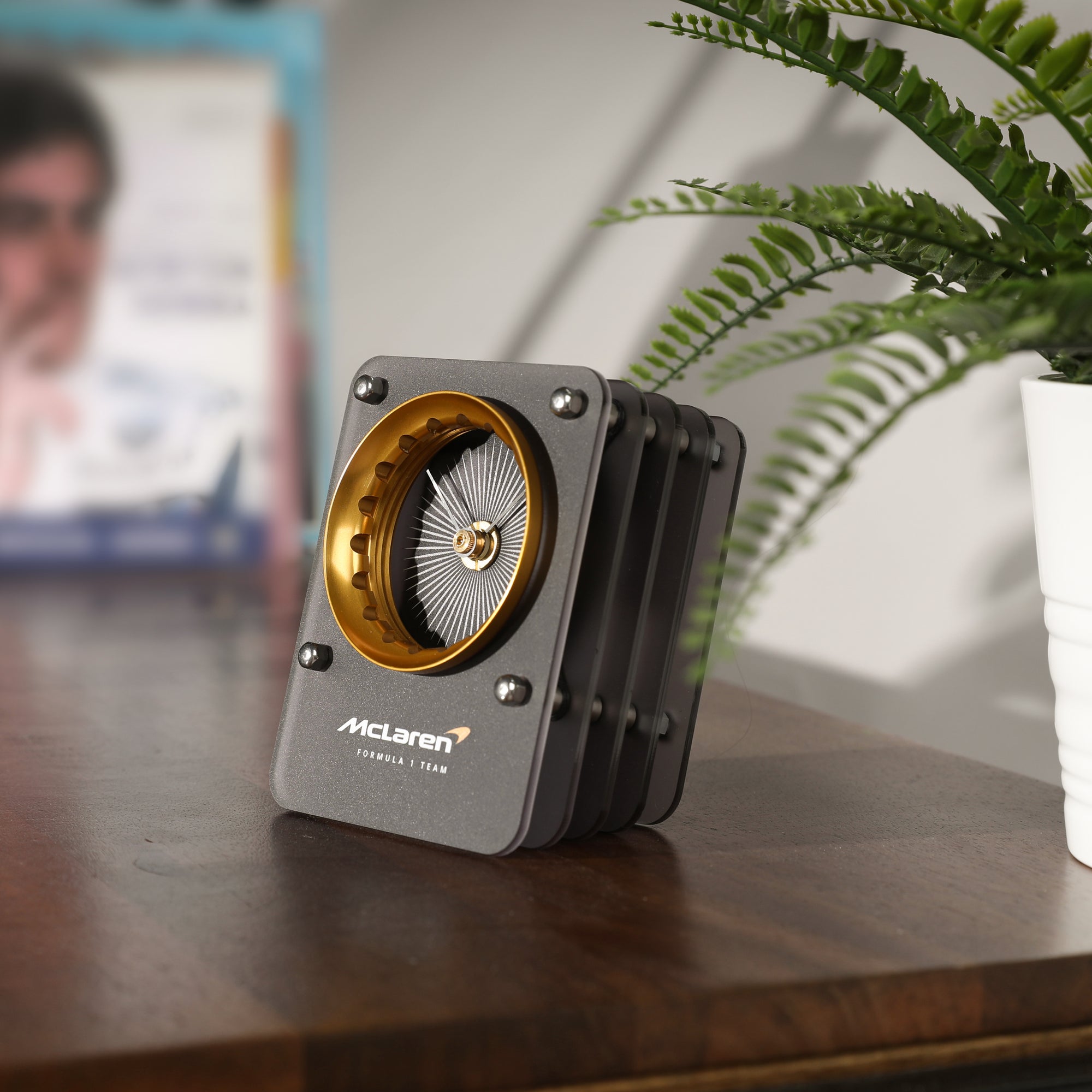 Crafted from an authentic a race-used wheel nut collar, this timepiece pays tribute to McLaren's illustrious history in motorsport. Our engineers have meticulously converted this wheel nut collar into a clock, merging track heritage with refined craftsmanship.