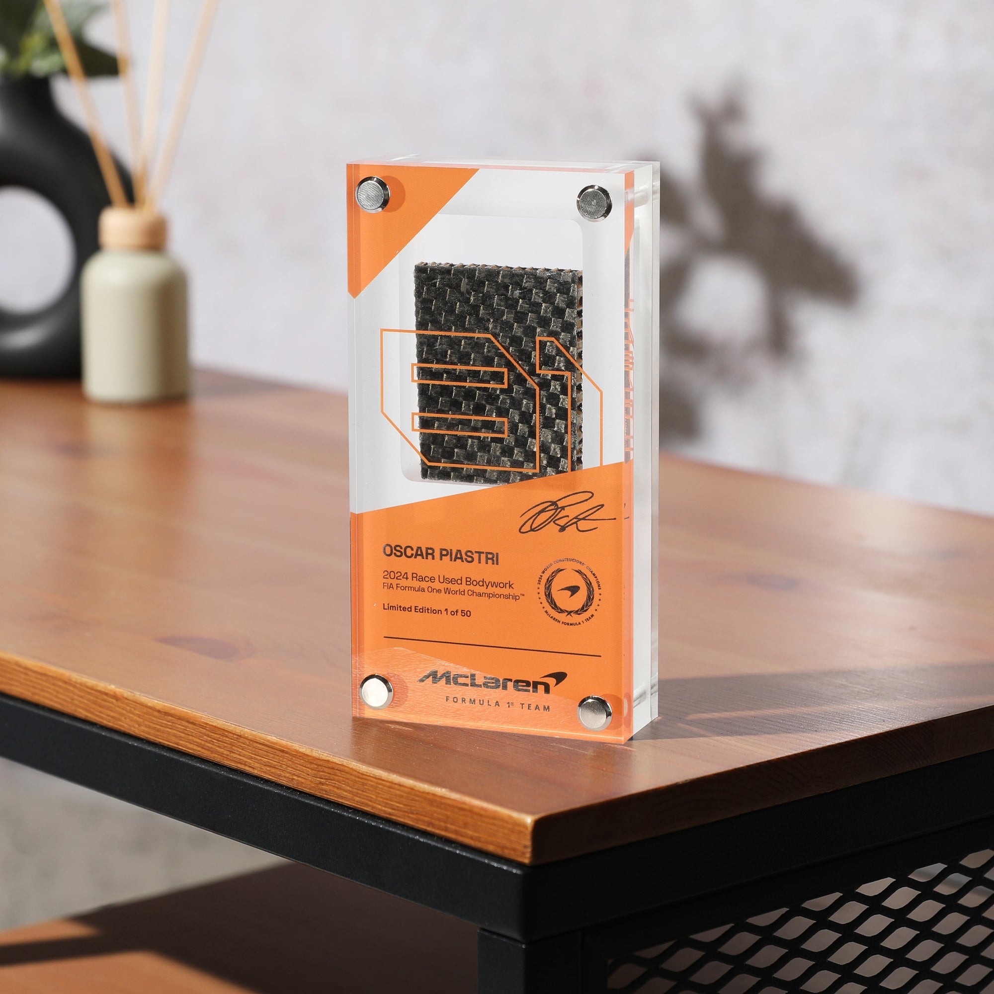 Celebrate Oscar Piastri and McLaren F1® Team with a genuine piece of bodywork, hand-cut from his 2024 MCL38 race car and presented in a striking display. This special Constructors’ Champions edition pays tribute to the iconic race team and their consecutive titles claimed in 2024 and 2025.