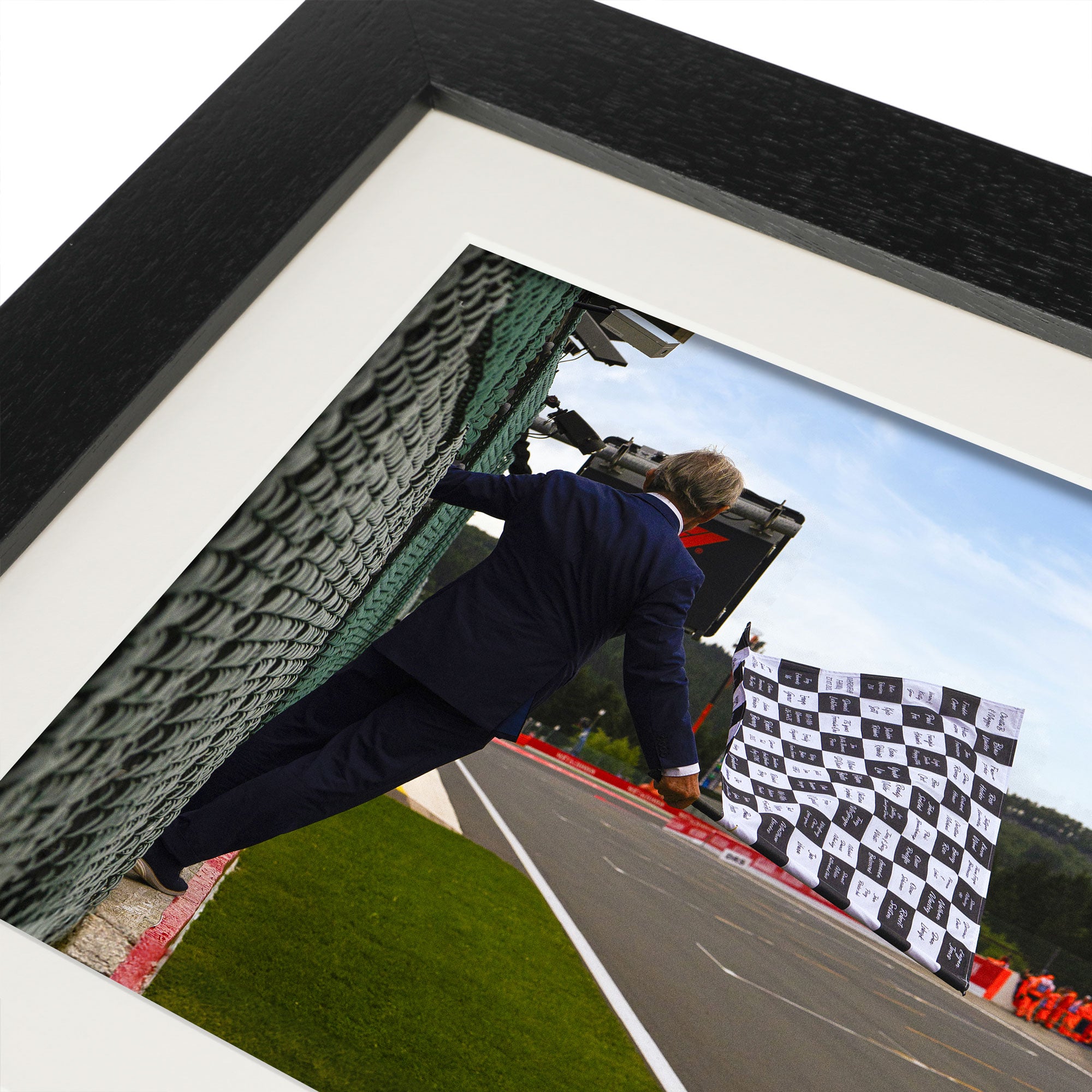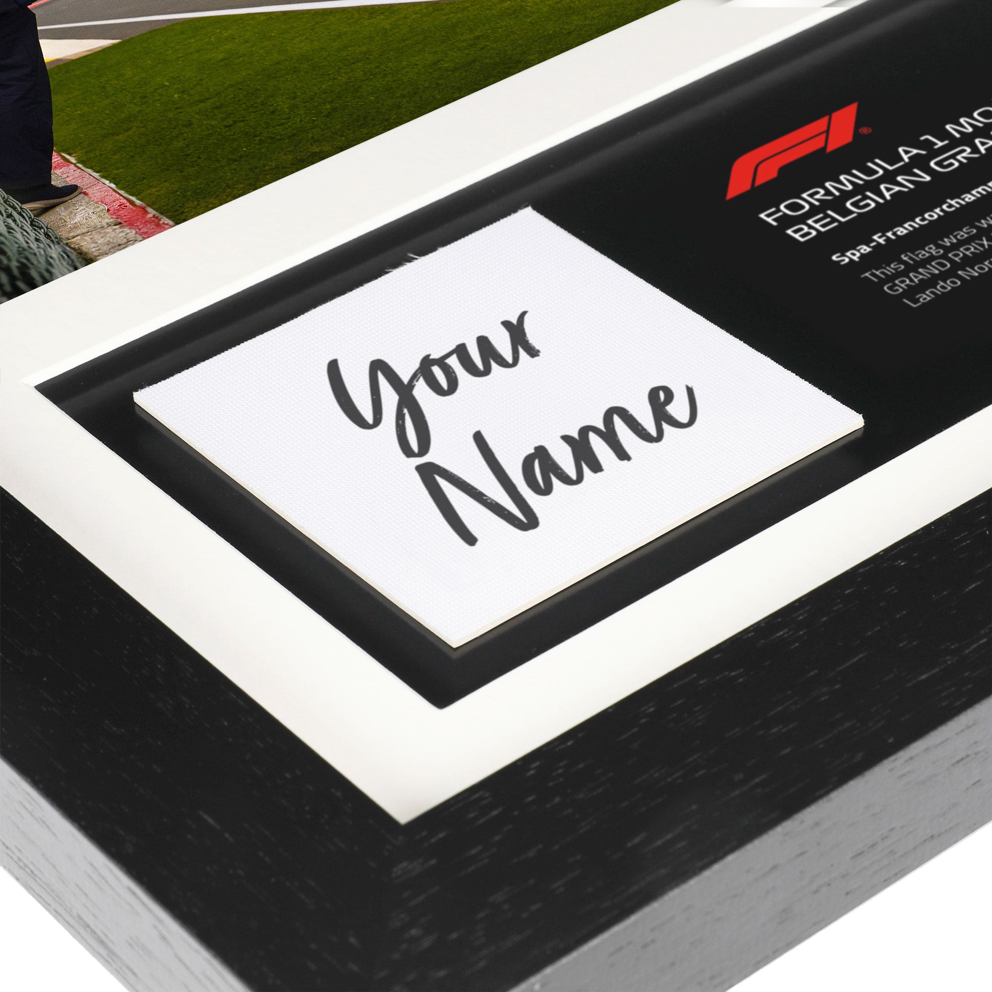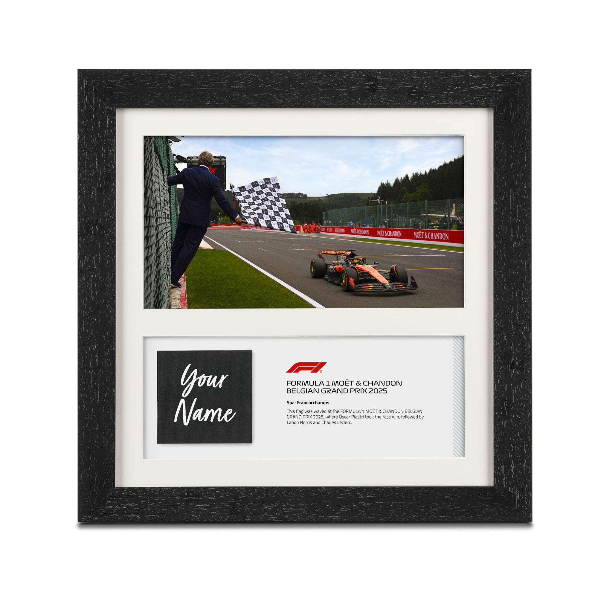 - We hand cut each square and professionally frame it, along with a photograph specific to race it was waved at taken by a professional F1 photographer