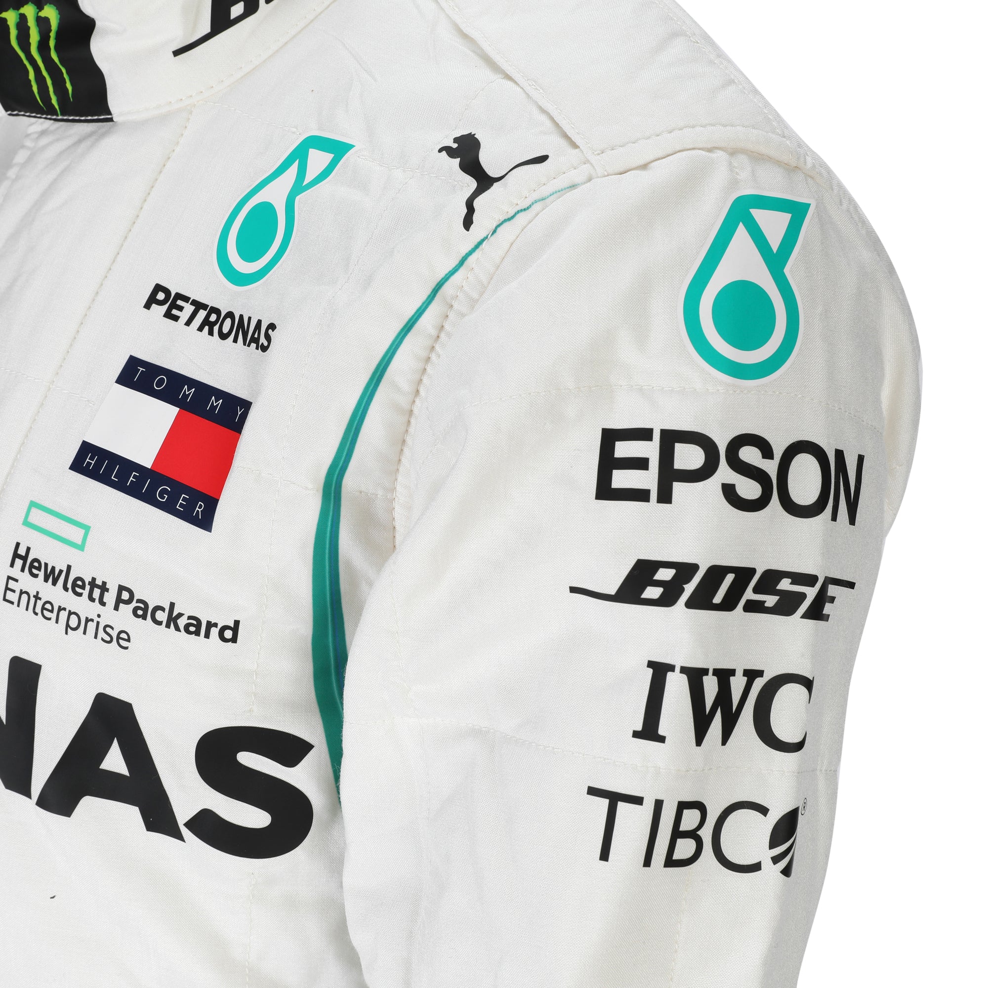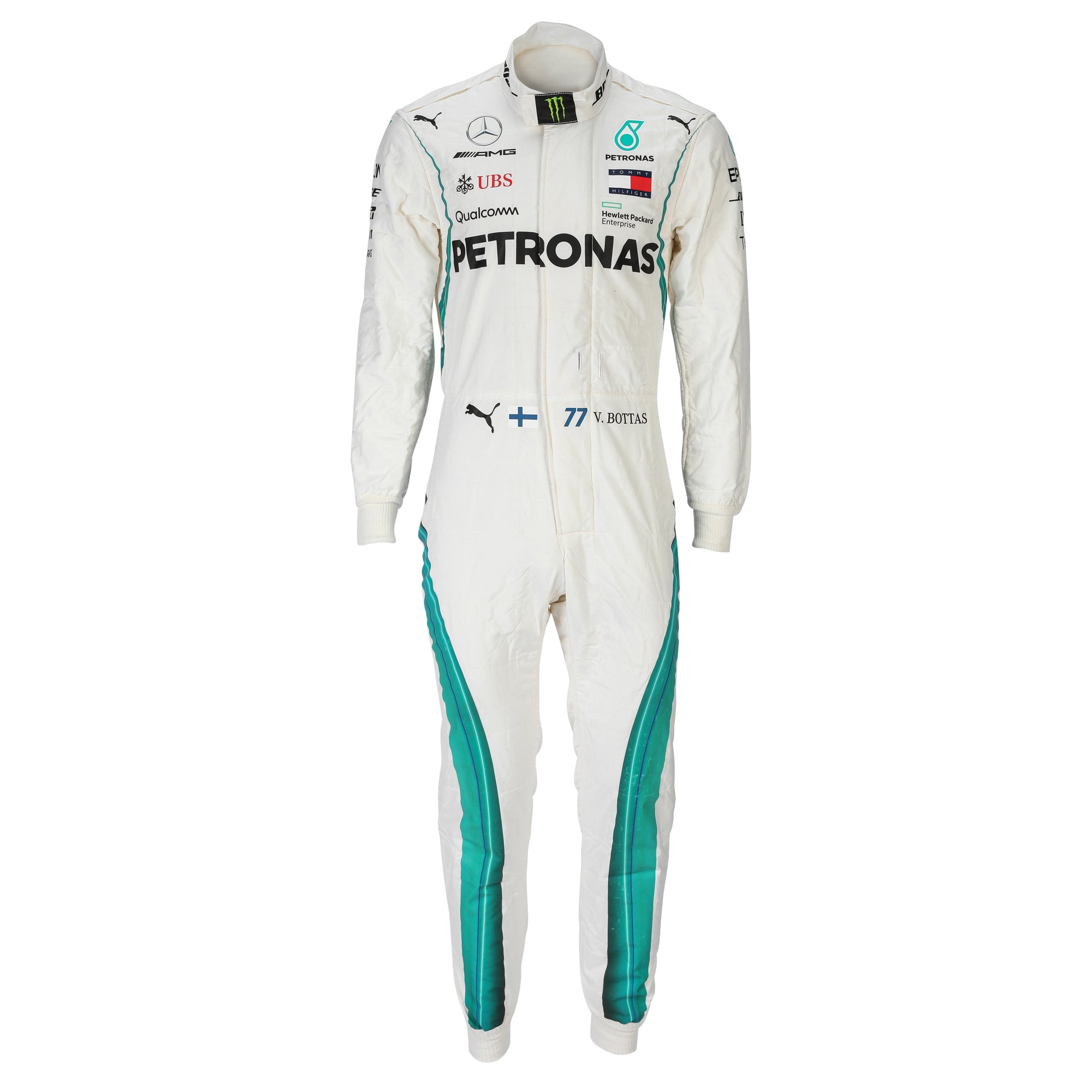 Featuring Mercedes-AMG Petronas’ distinctive silver and teal livery with period-correct 2018 team and sponsor branding, the suit reflects the identity of the Silver Arrows during one of their dominant championship-winning eras. Displaying authentic race-used character, it offers a direct connection to Bottas and a specific Grand Prix within the modern Formula One era.