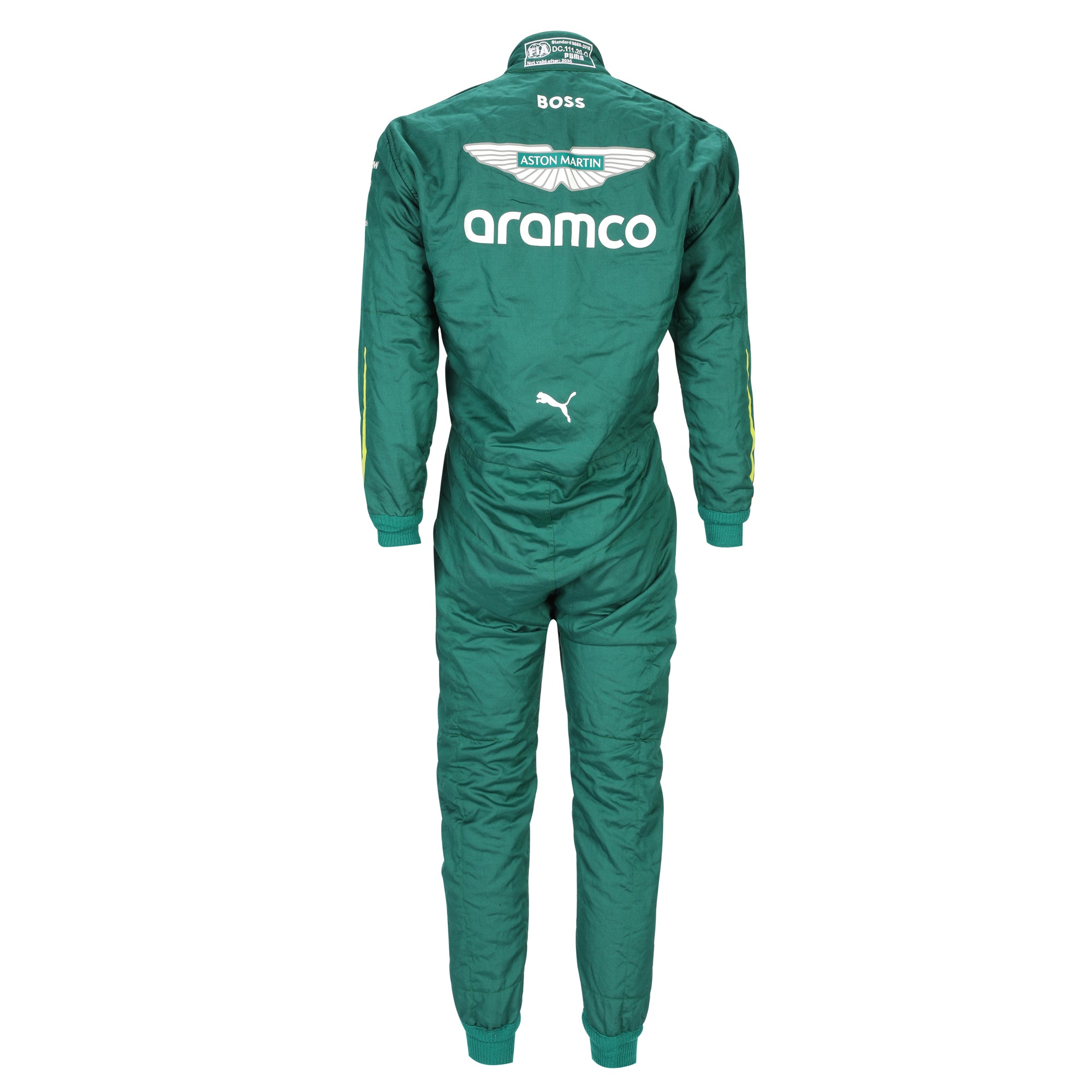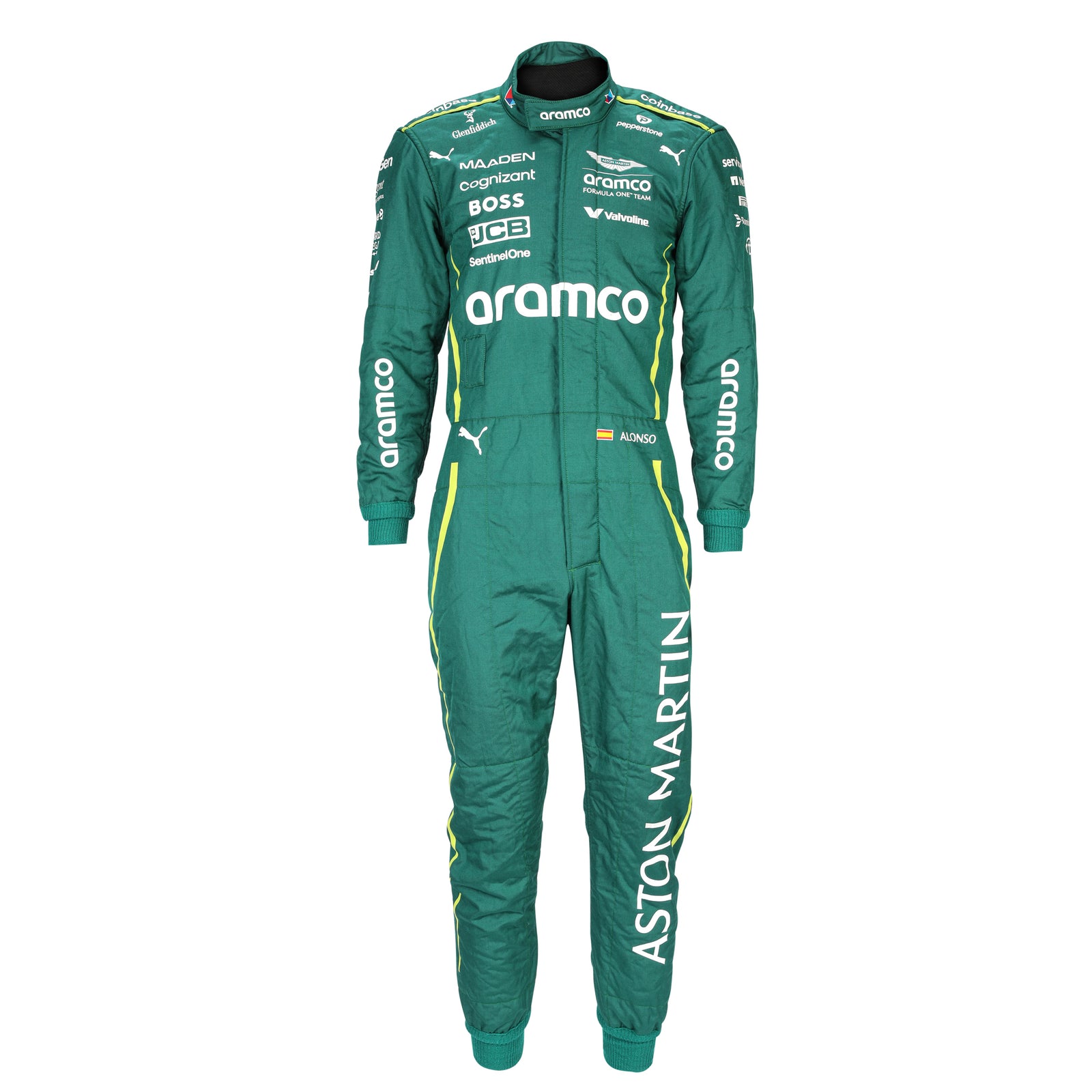 A contemporary race suit from Fernando Alonso’s 2025 Formula One campaign with Aston Martin Aramco, representing the continued excellence of one of the sport’s most experienced and accomplished drivers.