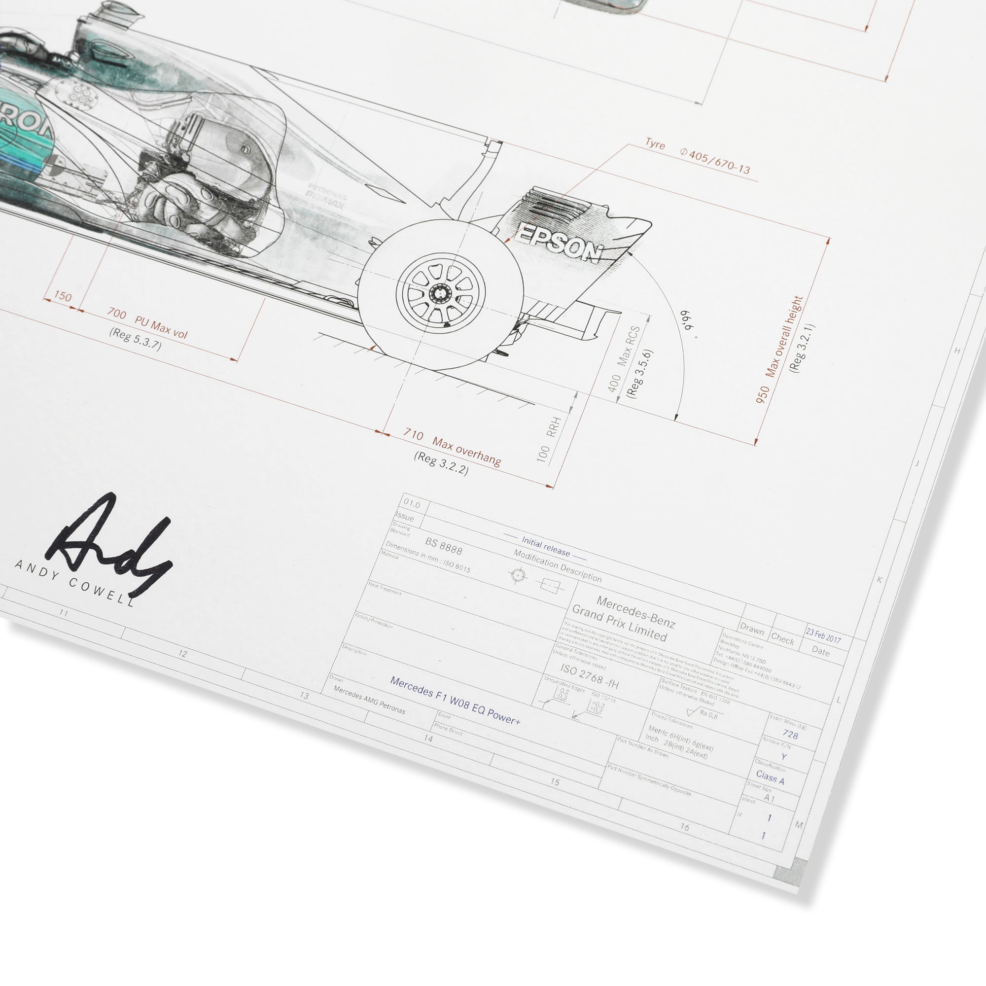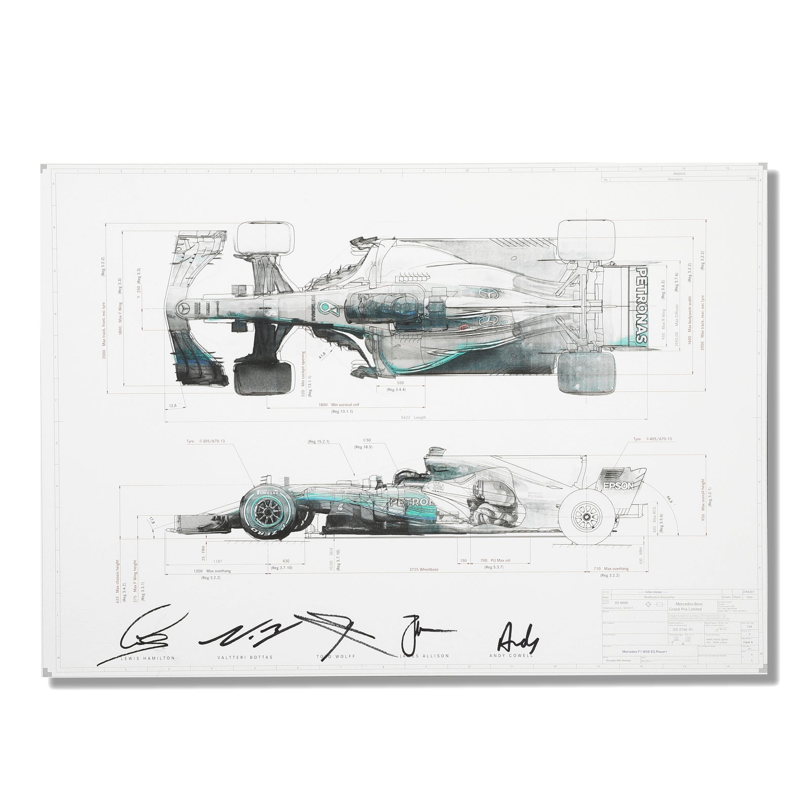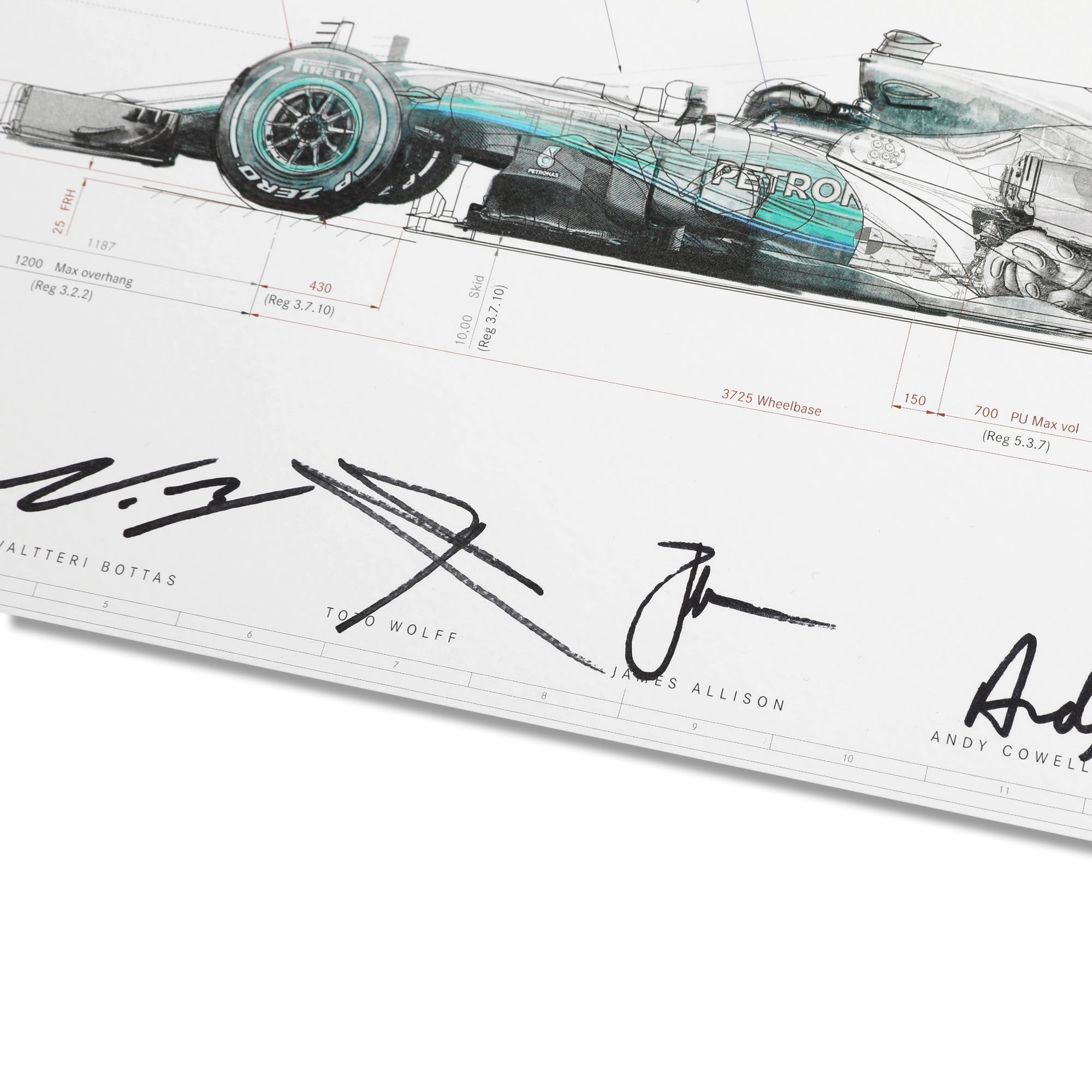 Season Launch LOT 408 - Mercedes 2017 Engineering Drawing - Signed by Lewis Hamilton, Valtteri Bottas, Toto Wolff and Alison Cowell