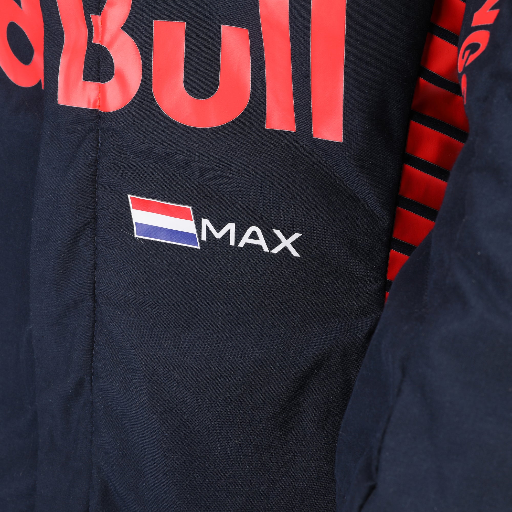 Constructed to FIA fire-resistant standards, the race suit was engineered to withstand the extreme cockpit temperatures and physical demands of modern Formula One competition. Featuring the distinctive dark blue Red Bull Racing livery alongside official team and sponsor branding, it reflects the visual identity of the team during a season of unparalleled success.
