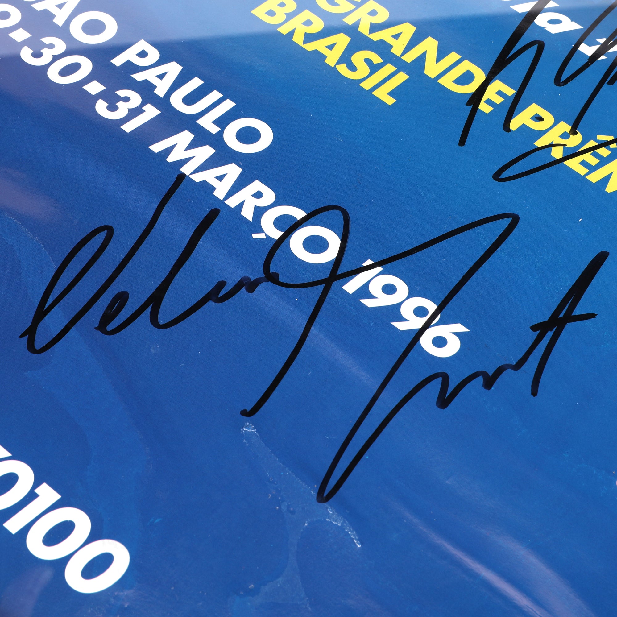 A remarkable multi-signed piece of Formula One memorabilia, this framed poster from the 1996 Brazilian Grand Prix brings together the signatures of five legendary names from the sport: Michael Schumacher, Jacques Villeneuve, Nelson Piquet, Damon Hill and Gerhard Berger.